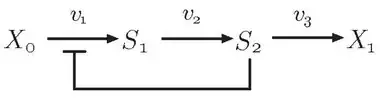 {\displaystyle X_{o}{\stackrel {v_{1}}{\longrightarrow }}S_{1}{\stackrel {v_{2}}{\longrightarrow }}X_{1}}
