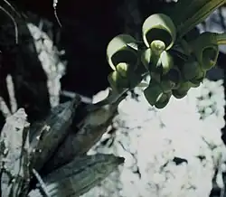 It has oblong-fusiform stems (pseudobulbs) carrying deciduous, ridged, many nerved, oblong-lanceolate, acute leaves. The leaves 4–5. Inflorescence arching to horizontal, 8-10 flowered.[1] Male flowers resupinate, triangular. sepals and petals are lanceolate, dark green marked with maroon. lip also triangular, white. Female flowers green. sepals and petals recurved.