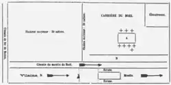 At the time, about twenty quarry workers worked in the quarry of Boël, near the mill of Boël.[4] The quarry was the property of a Mr. Ferrand, the miller of Boël, who bought it two or three months before the incident.[5] The workers were under the orders of Monsieur de la Bourdonnaye, châtelain and mayor of Laillé.[4] They earned about two francs per cubic meter of material.[6] According to the tradition of the country, to work faster and earn more money, the quarrymen had the habit of attacking the rock from below rather than mining it from the top layer.[6]