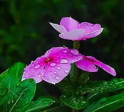 Catharanthus roseus, commonly known as bright eyes, Cape periwinkle, graveyard plant, Madagascar periwinkle, old maid, pink periwinkle, rose periwinkle,[2] is a perennial species of flowering plant in the family Apocynaceae. It is native and endemic to Madagascar, but is grown elsewhere as an ornamental and medicinal plant, and now has a pantropical distribution. It is a source of the drugs vincristine and vinblastine, used to treat cancer.[3] It was formerly included in the genus Vinca as Vinca rosea.