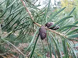 The leaves are needle-like, 2.5–5.5 cm (1.0–2.2 in) long, have ciliate (hairy) margins when young, and grow around the stems in a spiral pattern. The cones are 3–5 cm (1.2–2.0 in) long, with about 15–20 scales, each scale bearing two winged seeds.[3]