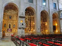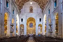 Inside, the cathedral is a one-aisled church of rectangular shape, without transept and with a very shallow main chapel. The interior of the church, similar to its frontispiece, is lined with lioz stone from Portugal. The side walls of the church have a series of lateral chapels decorated with altarpieces. This floorplan scheme is based on the Church of São Roque in Lisbon, the Jesuit church of the Portuguese capital, built a century earlier. The nave of the church has a deep central altar, two lateral chapels, two chapels at the transept, and three chapels at each side of the nave. The chapels were constructed at different times and reflect numerous architectural periods and styles.[2]