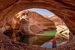 The Cathedral in the Desert is a natural formation, sometimes referred to as an amphitheater,[1] buried under Lake Powell in Glen Canyon.[2] Due to the Southwestern North American megadrought, the cathedral has been visible in 2005 and 2019. Lake Powell must drop to 3,605 feet for the cathedral floor to be visible.[3][4]
