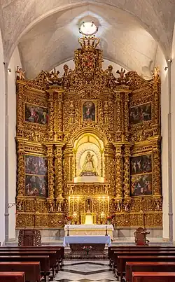 The altarpiece of the Our Lady of Remedies is in a chapel in the transept of the cathedral and is the largest altarpiece in the Canary Islands. It is a great Baroque altarpiece from the first half of the eighteenth century,[21] with an impressive set of seven panels attributed to Hendrick Van Balen, Van Dyck's teacher. The image of the Virgin of Los Remedios is located in the central niche and is adorned in rich robes and dresses. It is located in a spectacular canopy over a silver throne, with a sunburst of the same framing material and a golden crescent moon at her feet.