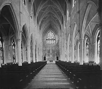 The Vatican erected the Diocese of Charleston in 1820.[1] However, its first cathedral, the Cathedral of Saint John and Saint Finbar, was not completed in 1854. It only last seven years before being destroyed in a fire that swept through Charleston in 1861. St. Andrews Hall, an 1815 structure next to the cathedral, was also destroyed. Due to the American Civil War and the resulting impoverishment of the diocese, the cathedral was not replaced for several decades.[2]
