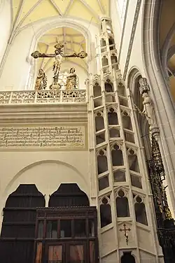 The presbytery was completed in 1508; this is considered to be the year when the cathedral's construction was finished. This is documented by a scroll dated from 1508 in the name of master builder Krumpholz, which was found in the presbytery pillar after a major renovation in 1908.[14]
