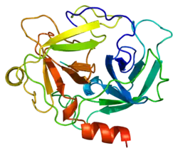 - ^ Salvesen G, Farley D, Shuman J, Przybyla A, Reilly C, Travis J (April 1987). "Molecular cloning of human cathepsin G: structural similarity to mast cell and cytotoxic T lymphocyte proteinases". Biochemistry. 26 (8): 2289–93. doi:10.1021/bi00382a032. PMID 3304423.