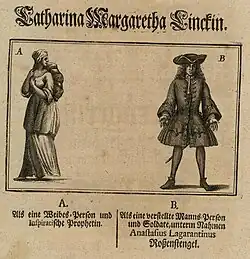In 1717, having adopted men's clothing once more and begun representing herself as a man named Anastasius Lagrantius Rosenstengel, Linck met and married 18-year-old Catharina Margaretha Mühlhahn at Halberstadt.[7] The court records detail their sexual activities. Linck "had made a penis of stuffed leather ... and had tied it to her pubes with a leather strap. When she went to bed with her alleged [sic] wife she put this leather object into the other's body and in this way had actually accomplished intercourse." Linck claimed to have performed similar acts with women she hired while she was a soldier. Linck testified to experiencing great excitement during intercourse: "whenever she was at the height of her passion, she felt tingling in her veins, arms, and legs".[8] The marriage was unsettled, with Mühlhahn's mother at times trying to separate the couple. Linck earned money through begging, and sometimes relocating to seek charitable support, was baptized a Catholic and then received baptism as a Lutheran. The trial record says that in a final confrontation Mühlhahn's mother "charged the defendant with being a woman and not a man", "ripped open her pants, examined her, and ... found not the slightest sign of anything masculine". Mühlhahn's mother provided the authorities with the artificial penis, along with a "leather-covered horn" that Linck wore next to her body and that allowed her to urinate while standing up.[9]