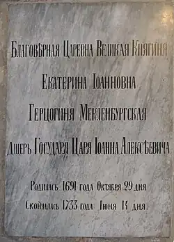 Tsarevna Catherine Ivanovna of Russia (20 October 1691 – 14 June 1733) was a daughter of Tsar Ivan V and Praskovia Saltykova, eldest sister of Empress Anna of Russia and niece of Peter the Great. By her marriage, she was a Duchess of Mecklenburg-Schwerin.