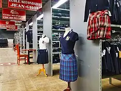 A Catholic school uniform in North America typically consists of a pleated and tartan skirt or jumper dress (a sleeveless dress), Mary Jane or saddle shoes, a button-up shirt, and a sweater for girls, while boys' uniforms consist of a button-up shirt, a necktie, and dark pants. Actual school uniforms vary widely by location and individual school.
