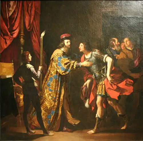 It shows the aftermath of Cato the Younger's defeat by Julius Caesar at the Battle of Thapsus as told in Plutarch's Parallel Lives, with Cato breaking off from reading Plato's Dialogue on the Immortality of the Soul to say goodbye to his son just before Cato's suicide.[1] It was one of nine works commissioned by Louis Phélypeaux, Seigneur of La Vrillière for the gilded gallery at his new hôtel de La Vrillière in Paris.