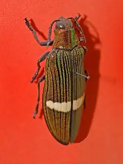 Catoxantha purpurea can reach a length of about 45–50 millimetres (1.8–2.0 in).[3] This beautiful jewel beetle has metallic reddish purple elytra with thick and prominent black costae and one yellow transverse bands. Legs and antennae are black. Abdominal sternum is yellow.