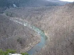 Caudy's Castle is a rock pinnacle of Ridgeley (Oriskany) sandstone that stands 1,070 feet (326 m) above sea level over the Cacapon River near the Bloomery Pike (West Virginia Route 127) south of Forks of Cacapon in Hampshire County, West Virginia, United States. The rock formation is named after James Caudy, an early Hampshire County pioneer and settler who fought off an attack by fifteen Native Americans from the rock during the French and Indian War.[1] Caudy's Castle is also known as the Castle Rock. The pillar lies on the southern end of its namesake, Castle Mountain.