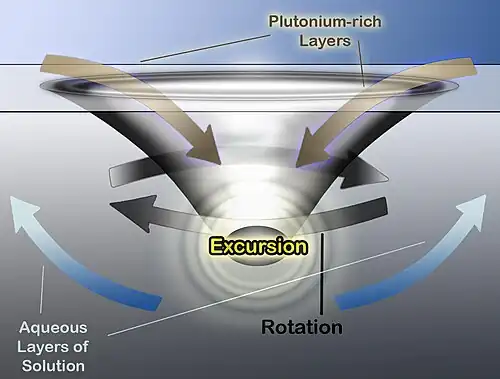 Among other ideal characteristics, the optimal shape for any fissile substance to become supercritical is the shape of least surface area, a sphere. Although the plutonium-rich solution was not spherical, the vortex made it thicker in the center, and this, along with the corresponding increase in density and the neutron reflectivity of the aqueous layer surrounding it, caused the dissolved plutonium to reach and cross the criticality threshold in approximately one second: neutrons within the mixture began to bombard the nuclei of the solution's plutonium atoms with sufficient frequency to cause these atoms to break apart and release other neutrons in a sustained nuclear chain reaction lasting only 200 microseconds but releasing a huge burst of neutrons and gamma radiation. Such an uncontrolled release of nuclear energy is often referred to as an excursion.[5] Within 3 seconds, the layers in the mixture had become dispersed, and no further excursions were possible.