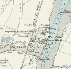 Cement Mills Halt primarily served the West Medina Cement Works,[5] which was owned and operated by Francis and Company Cement Manufacturers. Near the village of Northwood, was the extensive cement works of Messrs. Francis, Son, & Co., of Nine Elms, London, who employed about 100 people at the West Medina Cement Works in the manufacture of Portland and Medina cements.[6] The Francis Co. had the contract to supply all the Portland cement for the construction of the fourth Eddystone Lighthouse.[7]