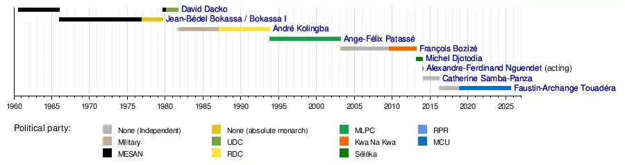 1981 | 21 September 1979[E] | 1 September 1981[13] | 1 year, 345 days | MESAN | This was Dacko's second time as president of the Central African Republic. In February 1980, Dacko established the Central African Democratic Union (UDC) as the country's only political party.[14] | |