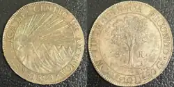 The real was the currency of the Federal Republic of Central America from the passing of the coinage law of 19 March 1824 to the dissolution of the republic in 1838.[2] Sixteen silver reales equaled one gold escudo, and a coin of eight reales was called a peso. The Central American Republic's real replaced the Spanish colonial real at par and continued to circulate and be issued after the constituent states left the Central American Republic. Federation coins were minted in Guatemala, Costa Rica, and Honduras, while additional provisional issues were minted at various points in Costa Rica, Honduras, and El Salvador.[2][3] Both Guatemala and Costa Rica continued minting coins in the style of the republican real until the late 1840s;[2] the currency was eventually replaced by the Costa Rican real, Salvadoran peso, Guatemalan peso, Honduran real and Nicaraguan peso.[2]