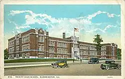 CCHS has roots in St. Mary's School, built at a cost of $26,000[nb 3][30] by Holy Trinity Parish in 1884 during the pastorate of Michael Weldon.[7]: 152 The building was located at the northeast corner of the intersection of Locust and Center Streets in Bloomington, Illinois.[31] Initially only a grade school, the building was altered in 1886 to add high school classes. Two graduates in 1898 composed the high school's first graduating class. The parish paid off the debt for the school building in 1909. In 1912 Illinois State University and the University of Illinois recognized St. Mary's high school curriculum. The graduating class that spring had twenty students.[10]