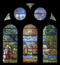 The larger stained-glass windows were designed by Jacob Holzer with work by the Duffner and Kimberly Company, and were installed over several years in the early 20th century. They depict the creation of the earth in the east and the heavenly city in the west, and are described as 'unsurpassed in the state.'[17] The First Century of Central Congregational Church (1952) provides a description of the window plan: