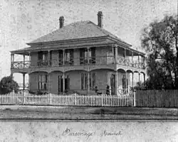 This two storey timber residence was built as the manse for the pastors of the Congregational Church of Ipswich. The Congregational Church Yearbook of 1883 describes the Manse during its construction as follows: "The edifice will be a two storeyed weather-board house with verandah balcony all round, containing 12 rooms and finished in a style that will do credit to the denomination". It was designed and erected by architect/builder Samuel Shenton, himself a member of the Congregational Church, costing £1221/18/7. Construction of the Manse was commenced and finished in 1883.[1]