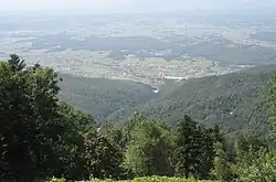 The Pannonian Basin took shape through Miocenian thinning and subsidence of crust structures formed during the Late Paleozoic Variscan orogeny. Paleozoic and Mesozoic structures are visible in Papuk and other Slavonian mountains. The processes also led to the formation of a stratovolcanic chain in the basin 12–17 Mya; intensified subsidence was observed until 5 Mya as well as flood basalts at about 7.5 Mya. The contemporary tectonic uplift of the Carpathian Mountains cut off the flow of water to the Black Sea, and the Pannonian Sea formed in the basin. Sediments were transported to the basin from the uplifting Carpathian and Dinaric mountains, with particularly deep fluvial sediments being deposited in the Pleistocene epoch during the formation of the Transdanubian Mountains.[15] Ultimately up to 3,000 metres (9,800 ft) of sediment was deposited in the basin, and the sea eventually drained through the Iron Gate gorge.[16] The result is large plains, particularly in river valleys, and especially along the Sava, Drava, and Kupa rivers. The plains are interspersed with horst and graben structures, believed to have broken the Pannonian Sea's surface as islands. The tallest among these landforms are 1,059-metre (3,474 ft) Ivanščica and 1,035-metre (3,396 ft) Medvednica, north of Zagreb.[8] Parts of 489-metre (1,604 ft) Moslavačka gora, along with igneous landforms on Papuk and Požeška gora mountains in Slavonia to the east, are possibly remnants of a volcanic arc from the same tectonic plate collision that caused the Dinaric Alps.[13][17]