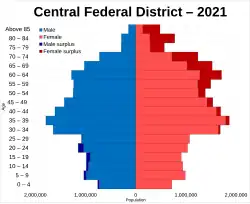 The Central Federal District (Russian: Центральный федеральный округ, IPA: [tsɨnˈtralʲnɨj fʲɪdʲɪˈralʲnɨj ˈokrʊk]) is one of the eight federal districts of Russia. Geographically, the district is situated in the extreme west of present-day Russia; although it can be considered as the central region of European Russia. The district covers an area of 650,200 square kilometers (251,000 sq mi),[2] and recorded a population of 40,334,532 (82.1% urban) in the 2021 Census.[6] The Presidential Envoy to the Central Federal District is Igor Shchyogolev.