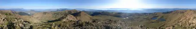 The Korab massif is the fourth highest peak in the Balkans, the highest peak of Albania and North Macedonia and also one of only two summits in Europe, which are the highest point for more than one country.[8] Furthermore, Korab is the 18th most prominent mountain summit in the Europe.[9] Other peaks include Maja e Moravës 2,718 m (8,917 ft), Mali i Gramës 2,345 m (7,694 ft) Korab II 2,756 m (9,042 ft), Korab III 2,724 m (8,937 ft), Korab Gates 2,727 m (8,947 ft), Maja e Moravës 2,718 m (8,917 ft), Shulani i Radomirës 2,716 m (8,911 ft) and Small Korab 2,683 m (8,802 ft). Korab encompasses 562 square kilometres (217 sq mi), 63.5% within the Albanian territory.[10] The Albanian part of the mountain range is a protected nature park.