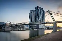 In 2020, a large real estate was unveiled on the western tip of the park, "River Tower".[6] Located along the river, in the vicinity of Łuczniczka and Torbyd halls, it consists of a pair of 64 metres (210 ft)-high and 20-floors towers. The twin buildings, encompassing 128 apartments, are the tallest residential edifice in Bydgoszcz and houses also a restaurant, a gym, a playing ground for children and a mini-marina.[7]