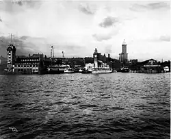 Shipping lines with facilities on Central Waterfront piers in the 1920s included local steamer companies, but also the Grand Trunk Pacific Steamship Company, the Royal Mail Steam Packet Company, the East Asiatic Steamship Company, the Cosmos Line, the Osaka Shoshen Kaisha, the Hamburg America Line, the Blue Funnel Line, and such mercantile tenants as Seattle Pacific Marine Supply and W. R. Grace and Company.[96]