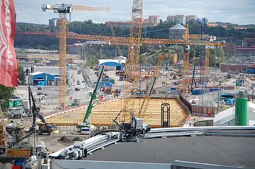 Public passenger areas will have a ceiling height of 8 metres (26 ft).[17] The new building will also have a park on its roof aimed at promoting biodiversity of plants, insects and birds.[18] The building has a wide range of environmentally sustainable solutions, e.g. its facades will be built using recycled bricks.[19] The station is expected to quality for Breeam Outstanding.[20] When the name was announced, it drew widespread criticism for being non-Swedish and allegedly pretentious.[21][22][23][24][25][26]