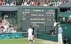 The first full match to be played with the roof closed was a men's singles fourth round match between British player Andy Murray and Switzerland's Stanislas Wawrinka. Play on Centre Court had never gone past 9:17 pm, but with the roof closed and the floodlights on, the match could be completed after dark – at 10:38 pm.[15][16] Merton Council's environmental chief David Simpson said after Murray's late-night win that late-night tennis would not cause any problems.[17] However, when the record late finish was surpassed in 2010 during a match between Novak Djokovic and Olivier Rochus which ran until 10:58 pm it was reported that Merton council had imposed a curfew of 11:00 pm BST on Centre Court.[18] This was then exceeded on Saturday 30 June 2012, when Andy Murray beat Marcos Baghdatis in their 3rd round match, which was completed at 11:02 pm, in spite of the 11:00 pm ruling.[19]