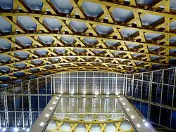 The roof is the major achievement of the building: a 90 m (300 ft) wide hexagon echoing the building's floor map. With a surface area of 8,000 m2 (86,000 sq ft), the roof structure is composed of sixteen kilometres of glued laminated timber, that intersect to form hexagonal wooden units resembling the cane-work pattern of a Chinese hat. The roof's geometry is irregular, featuring curves and counter-curves over the entire building, and in particular the three exhibition galleries. Imitating this kind of hat and its protective fabric, the entire wooden structure is covered with a white fibreglass membrane and a coating of teflon, which has the distinction of being self-cleaning, protecting from direct sunlight, while providing a transparent view at night. The roof structure can be seen from high up during both day and night in Metz from above, an aerial movie made by French photographer Yann Arthus-Bertrand.[6]