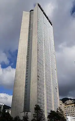Its address is 28th Street # 13A - 15, it has 17 elevators, the service areas and the emergency stairs. The exterior of the building is defined by glass paneling and both lateral sides by only one vertical line of windows. The tower has a large open space in front of its entrance. The tower is in use and is the third tallest building in Bogotá. When it was completed in 1977, it was the tallest building in Latin America, and it continued to be so until the construction of the Colpatria Tower.