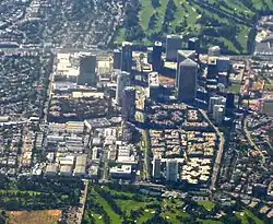 Century City is a 176-acre (71.2 ha) neighborhood and business district in central Los Angeles, California, United States. Located on the Westside to the south of Santa Monica Boulevard around 10 miles (16 km) west of downtown Los Angeles, Century City is one of the most prominent employment centers in the Los Angeles metropolitan area, and its skyscrapers form a distinctive skyline on the city's westside.