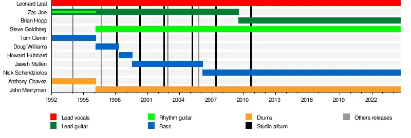 Cephalic Carnage formed in Denver, Colorado, in 1992 by vocalist Leonard Leal, drummer Anthony Chavez, bassist Tom Clenin, and guitarist Zac Joe. The quartet recorded a demo EP titled Scrape My Lungs in 1993, but then took a break until 1996, when they recruited drummer John Merryman, guitarist Steve Goldberg and bassist Doug Williams.[2][3] Merryman also collaborated with Secret Chiefs 3.[4] Soon after the reformation, their second demo EP Fortuitous Oddity was released. During 1997, Cephalic Carnage financed its own tour across the United States.[2][3]