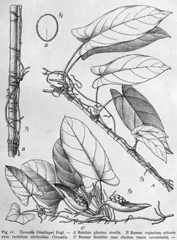 Cercestis dinklagei is a species of flowering plant in the family Araceae that is native to West and West Central tropical Africa.[1] It is a slender stem climber that produces long leafless shoots called flagella at intervals along the stem.[2] The leaves of Cercestis dinklagei are petiolate and glabrous, with a petiole that is 4-8 inches long and a blade that is 6-10 inches long.[3] The blade is elongated-sagit-tate-lanceolate or hastate, with a front lobe that is oblong-lanceolate and acuminate.[3]