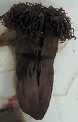 Ceriantheomorphe brasiliensis constructs a long, tough tube to line its burrow, strengthening it with mucus secretions. The tube is made with a felt of very long, discharged nematocyst cells and is sufficiently rigid for it to be excavated intact from the surrounding sediment.[5] The tentacles are assorted into two distinct marginal and labial cycles, each arranged into four pseudo-cycles with yellow coloration on the end of each tentacle. The marginal tentacles are located on the peripheral and are much longer than the labial. Ceriantharia have adapted large pores on the surface of their tentacles as a mechanism to retract into their tubes to avoid predation faster.[6] The tube is approximately 1–3 cm thick in adults, but it can be much thinner in younger or smaller species. Other species of Cerianthidae have various tube lengths, while C. brasiliensis' tube is relatively short. When the species is removed from its tube, it can regenerate a very thin replacement within 12 hours. Within 7–10 days, the tube can reach a thickness again that will help protect it from predators. The tube production starts in an area around the tentacles and continues in a ring formation down the body of the anemone, meaning it has an open end in the basal region. Additionally, since there is no limit to how far the anemone can lower itself into its tube, it can use this as a means to escape predation.[7] The Phoronid worm species Phoronis australis has an obligate commensalism relationship with C. braziliensis, where it gets a substrate, food, and protection from predation from the anemone.[8]