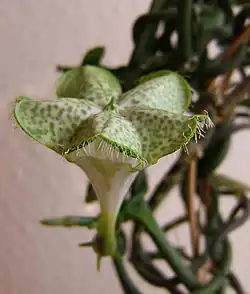 It is an evergreen, prostrate, slender twiner, nearly hairless, with sparse, succulent leaves. The roots form narrowly fusiform clusters. The distinctive greenish white funnel-shaped (having a corolla-tube) flowers are 5–7 cm long and are placed on a delicate stalk. Due to the fact that the corolla lobes are partially fused, the opening of the flowers is partially inhibited. The tips of the petals do not separate, but instead form a roof or umbrella-like dome on the flower, while the fused bottom forms the tube. The openings between the petals are also referred to as windows, hence the name windowed flowers.[1] The flower itself serves as a biological fly-pollinated pitfall-trap, that traps flies when they descend into the corolla tube. Small hairs that point downwards prevent the insect from escaping. Once trapped, the fly is thoroughly covered in pollen and only released when the flower reaches the end of its life and the hairs weaken.