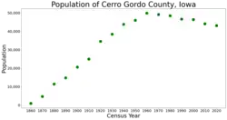 Cerro Gordo County (/ˈsɛroʊ ˈɡɔːrdoʊ/; Spanish: [ˈsero ˈɣoɾðo]) is a county located in the U.S. state of Iowa. As of the 2020 census, the population was 43,127.[1] Its county seat is Mason City.[2] The county is named for the Battle of Cerro Gordo, which took place during the Mexican–American War.