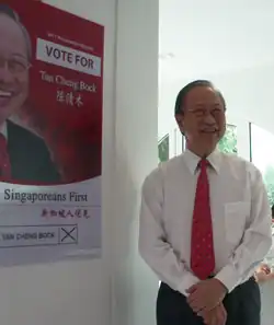 - ^ The total number of votes cast was 2,156,389, made up of 2,118,540 valid votes and 37,849 rejected votes (1.76% of the total): Statement of the Poll in a Presidential Election (G.N. No. 2465/2011) dated 31 August 2011, archived from the original on 2 September 2011. See also Li Xueying (28 August 2011), "Tony Tan is president: He wins by 7,269 votes after recount", The Sunday Times, pp. 1–2; Loh Chee Kong (28 August 2011), "Dr Tony Tan is Singapore's next President: Former Deputy Prime Minister edges out Dr Tan Cheng Bock in an intensely-fought contest", Today on Sunday, p. 1, archived from the original on 28 August 2011; Andrea Ong (1 September 2011), "Tony Tan gets almost 40% of overseas votes", The Straits Times, pp. A1 & A8; Tan Qiuyi (1 September 2011), "Final vote tally for PE", Today, p. 6, archived from the original on 22 September 2011.