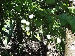 The fruits are white berries (which are distinguished from the black fruits of Cestrum parqui), 8 to 12 mm long, with seven to nine seeds, which are about 3 to 5 mm long.[5]