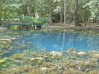 A major feature of the landscape park are the Fontaines Bleues, natural springs whose waters are an unusual brilliant hue of blue. There is also a round dovecote structure with a conical roof, dating from 1740, with fifteen hundred nesting holes.