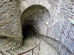 Located in the north-east angle of the enclosure, the keep is actually the former citadel of the medieval closed-town and the heart of the medieval defensive system, forming a small castle on its own isolated from the rest of the site. In origin it was made up of three main towers linked by curtain walls - to the south, the tour Duchesse Anne, to the north the tour du Donjon, to the west the tour Azénor. The main entrance was from the west, formed of a crenelated gate and a drawbridge across the moat separating the citadel from the rest of the castle-town. This collection of works formed a polygonal courtyard, at 2.2m below present ground level, housing a well, oubliettes and several underground rooms.
