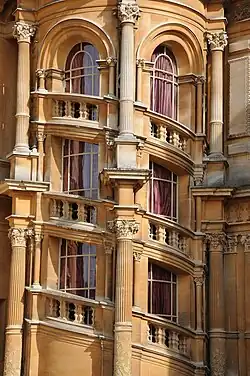 Yet in the later half of the 19th century, the château's style proliferated across the United Kingdom, influencing the Founder's Building at Royal Holloway, University of London, designed by William Henry Crossland[33] and the main building of Fettes College in Edinburgh, designed by David Bryce in 1870.[34][35] Between 1874 and 1889, the country house in Buckinghamshire, Waddesdon Manor, was built with similar architectural frameworks as the Château de Chambord, disseminated via the architect Gabriel-Hippolyte Destailleur. For instance, the twin staircase towers, on the north façade, were inspired by the staircase tower at the château.[36] However, following the theme of unparalleled luxury at Waddesdon, the windows of the towers at Waddesdon were glazed, unlike those of the staircase at Chambord, and were far more ornate.