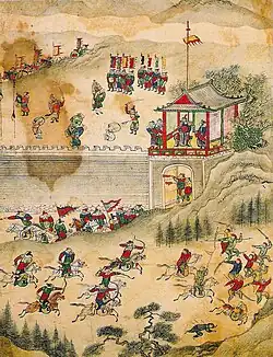 In the 10th month of 1594, Chŏng Hyŏllyong initiated an assault on Yŏksu.[44] He secretly gathered 1,325 soldiers from the Six Garrisons (Yukchin) along with 25 surrendered Japanese (hangwae) in Chongsŏn and surrounded the village.[45] The villagers retreated into the fortress and prepared for battle. Chŏng deployed the 25 Japaneses as the vanguard and ordered his force to set fires and dig tunnels to undermine the stronghold.[46] However, the Yŏksu's force resisted fiercely, launching arrows and hurling stones from their elevated position, forcing Chŏng's forces to temporarily withdraw.[42]
