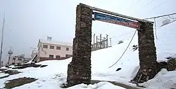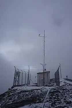 Chacaltaya (Mollo language for "bridge of winds" or "winds meeting point", Aymara for "cold road"[1]) is a mountain in the Cordillera Real, one of the mountain ranges of the Cordillera Oriental, itself a range of the Bolivian Andes. Its elevation is 5,421 meters (17,785 ft). Chacaltaya's glacier — which was as old as 18,000 years — had an area of 0.22 km2 (0.085 sq mi) in 1940, which had been reduced to 0.01 km2 (0.0039 sq mi) in 2007 and was completely gone by 2009.[2][3][4] Half of the meltdown, as measured by volume, took place before 1980.[5] The final meltdown after 1980, due to missing precipitation and the warm phase of El Niño, resulted in the glacier's disappearance in 2009.[6] The glacier was located about 30 kilometers (19 mi) from La Paz, near Huayna Potosí mountain.