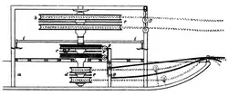 The first practical attempts to use a cable boat were in 1732 at the instigation of Marshal Maurice of Saxony, then in French service. These took place on the River Rhine in the vicinity of Strasbourg.[3] Three pairs of cylinders of various diameters were arranged on a horizontal shaft and driven by two horses. Depending on the required force, the rope was hauled in by winding it round one of the pairs of cylinders whilst the other two pairs coasted. The variable ratio allowed for a better utilization of force. Compared with the towing from the land this system could move double the load for the same number of draught horses per craft.[7]