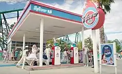 The next scene shows Perry riding a roller coaster. Savage says that the actual roller coaster is called Full Throttle,[46] which has the tallest loop in North America. The scene changes to "The Great American Dream Drop", where a young couple snuggles in a tiny house that gets flung high into the air and then plunges into the ground.[51]