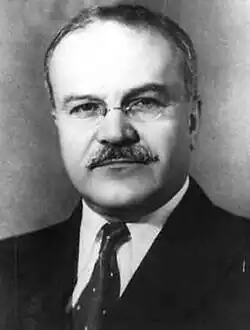 On 6 May 1941, Molotov was relieved of his post as chairman of the Council of People's Commissars of the Soviet Union, taking the post of deputy head of government. The official reason for Molotov's resignation was his many requests, motivated by the difficulty to fulfill the duties of head of government along with the duties of the People's Commissar of Foreign Affairs.[4] According to some historians, the real reasons for the removal of Molotov from the leadership of the government were Joseph Stalin's personal dislike and the latter's decision to take the post of chairman of the Council of People's Commissars of the Soviet Union to concentrate the party and executive state power in a difficult international situation on the eve of Germany's invasion of the Soviet Union.[5]