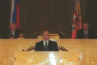 The Chairman of the Federation Council of the Federal Assembly of the Russian Federation (Russian: Председатель Совета Федерации Федерального собрания Российской Федерации), also informally called Speaker (спикер), is the presiding officer of the upper house of the Russian parliament. It is the third highest position, after the President and the Prime Minister, in the government of Russia. In the case of incapacity of the President and Prime Minister, the chairman of the Federation Council becomes Acting President of Russia.[1][2]